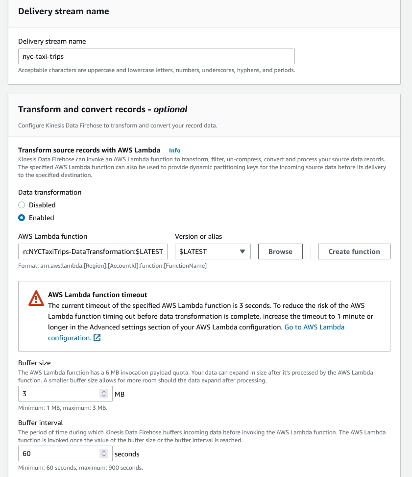 4. Delivery Stream 이름에 nyc-taxi-trips 입력합니다. Data transformation를 Enabled로 선택하고 Browse를 클릭해서 NYCTaxiTrips-DataTransformation 람다 함수를 선택합니다. 해당 람다 함수는 수신한 데이터에 source 필드를 추가하고 해당 필드의 값을 NYCTAXI로 지정합니다.