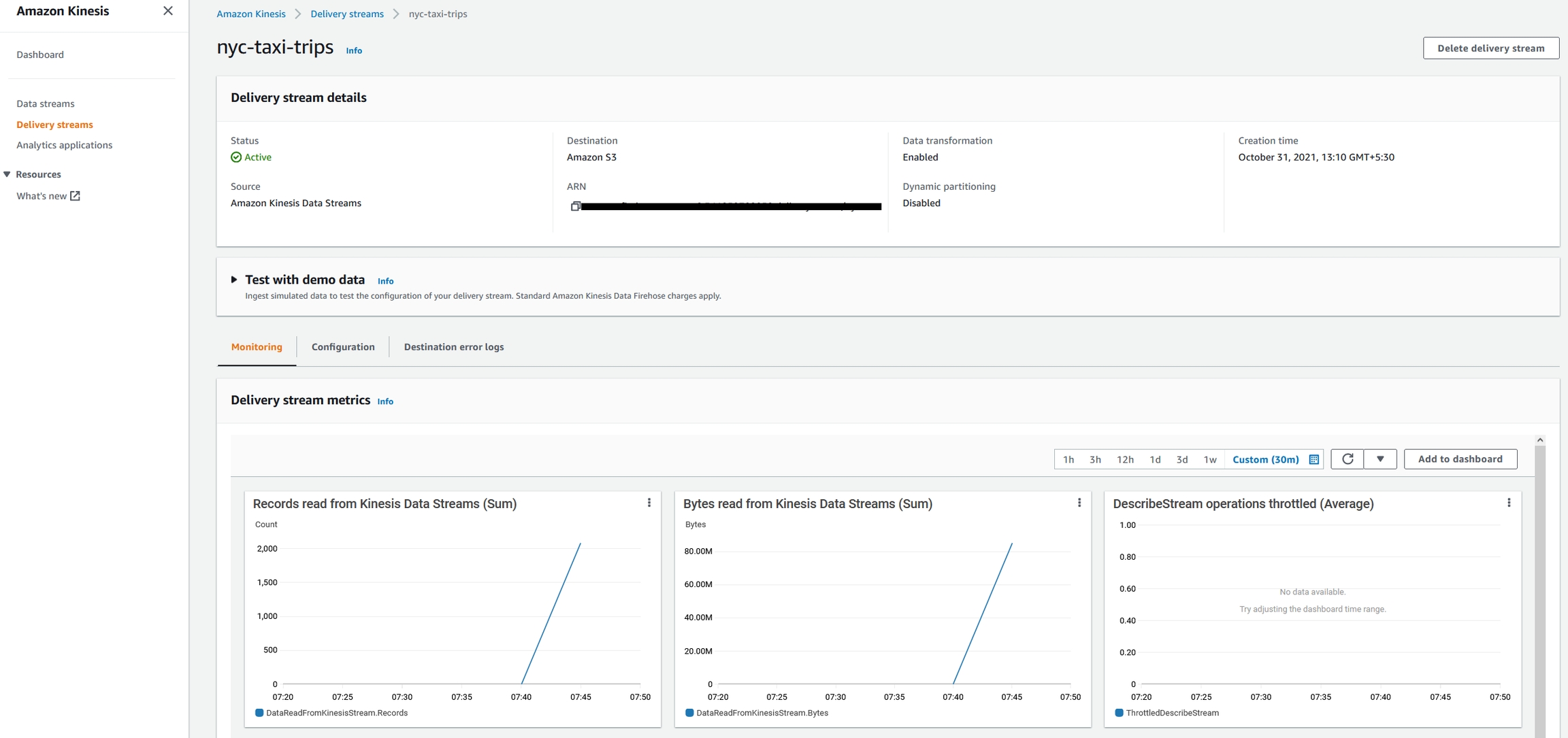 4. Kinesis 콘솔로 이동하여 nyc-taxi-trips Data Firehose Delivery Stream을 클릭합니다.