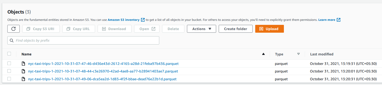 7. 몇분이 지나면 S3 버킷에 일부 데이터가 표시되어야 합니다. 그렇지 않다면 조금 더 기다려 주십시오. Parquet 형식의 데이터 파일이 보일 때까지 nyctaxitrips 폴더의 하위 폴더로 이동합니다.