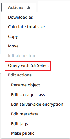 8. Parquet 파일 중 하나를 선택하십시오. 그런 다음 Actions에서 Query with S3 Select를 선택합니다.