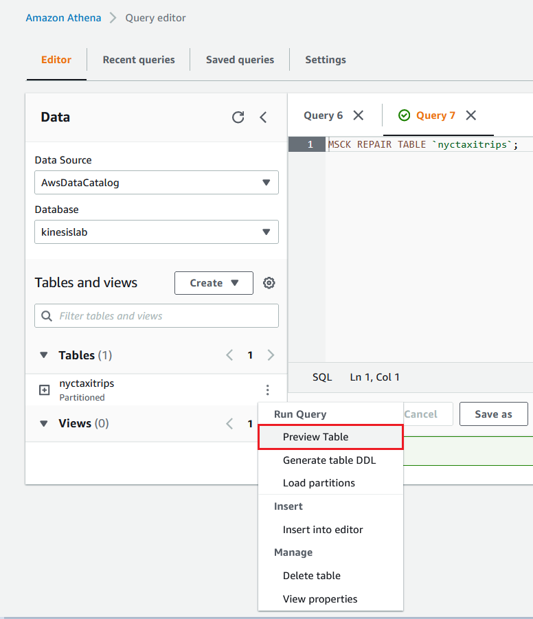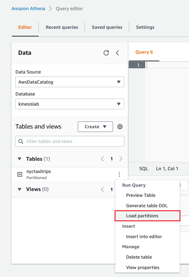 12. Editer 탭에서 Database 리스트에서 kinesislab을 선택하고 Tables 섹션 아래에 있는 nyctaxitrips 테이블 오른쪽에 있는 세로 줄임표 () 를 클릭해서 Load patitions를 클릭합니다.