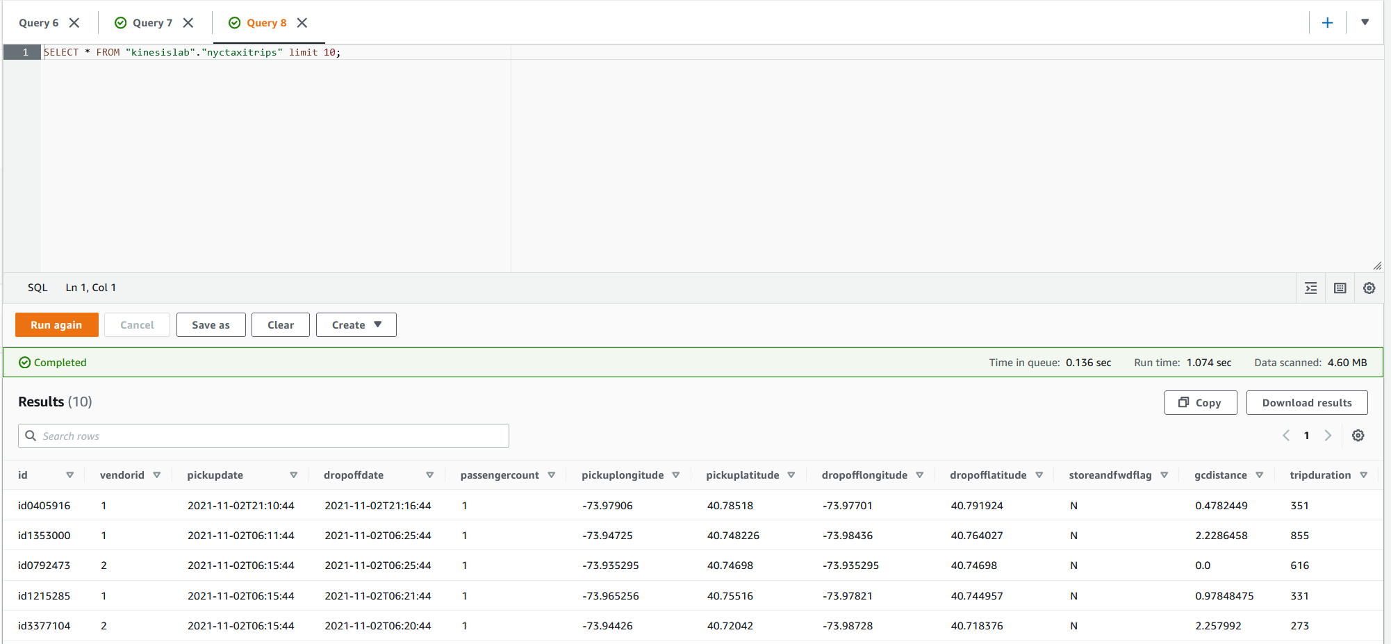 10. 퀴리 실행이 완료되면 Query results탭 에서 CSV 형태로 불러온 데이터를 확인할수 있습니다.