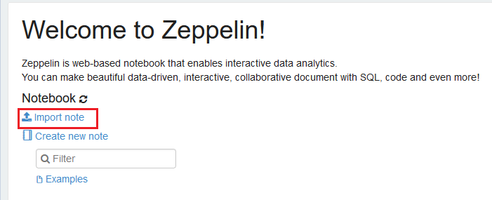 3. 해당 링크를 통해서 Zeppelin 노트북 파일을 다운로드 받고 import note를 선택해서 다운받은 노트북을 Zeppelin으로 불러옵니다.