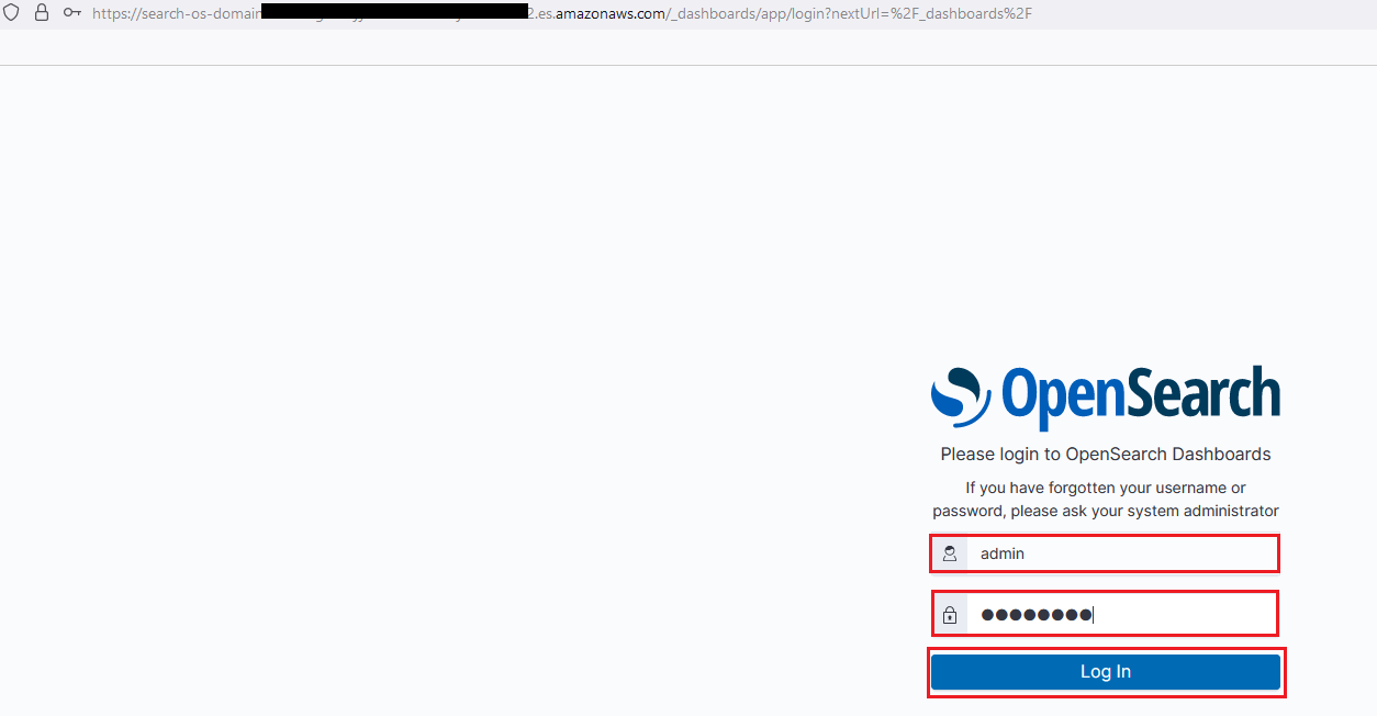 14. 브라우저를 열고 OpenSearch 콘솔에서 확인한 OpenSearch Dashboard URL을 입력합니다. username과 password 값에 Secrets Manager에서 확인한 값을 넣고 로그인합니다.