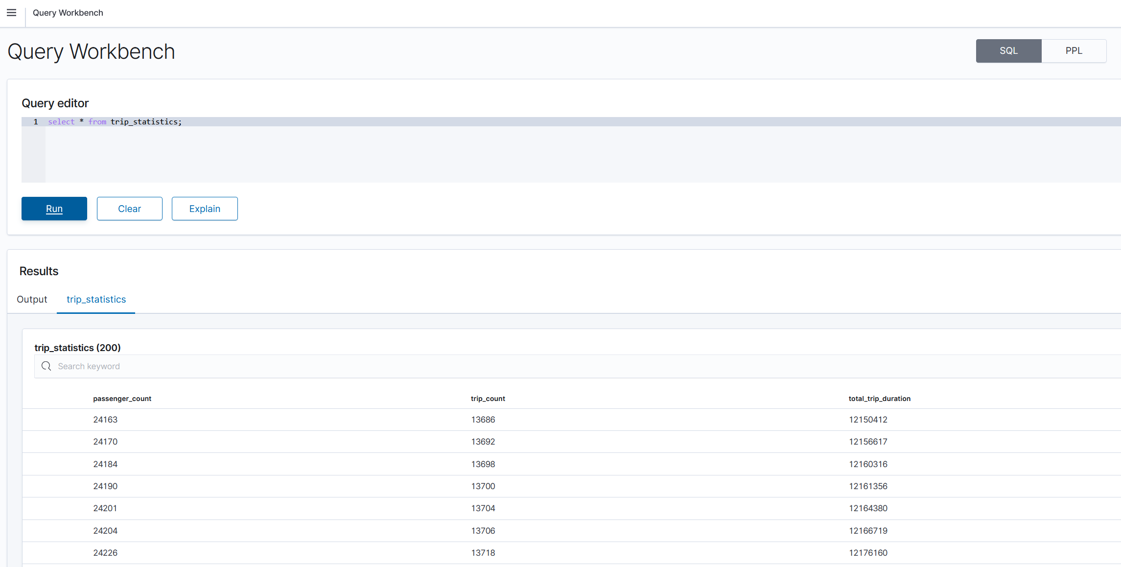 16. 쿼리 편집기에 select * from trip_statistics;를 입력하고 Run을 클릭합니다. Results 패널에서 집계된 레코드를 볼 수 있습니다.