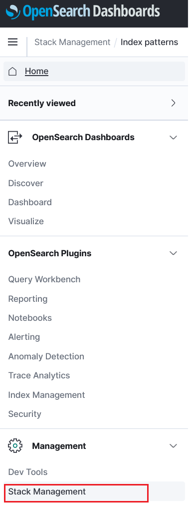 17. 이제 대쉬보드를 생성해 보겠습니다. 왼쪽 패널의 Management에서 Stack Management를 선택 합니다.
