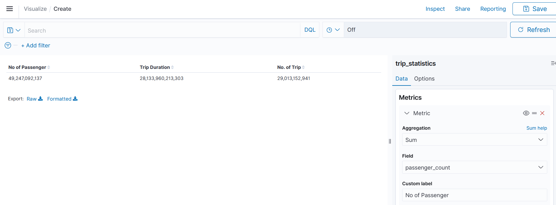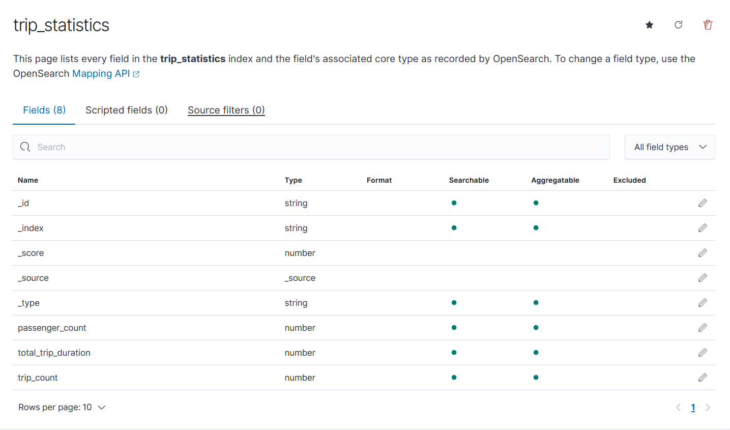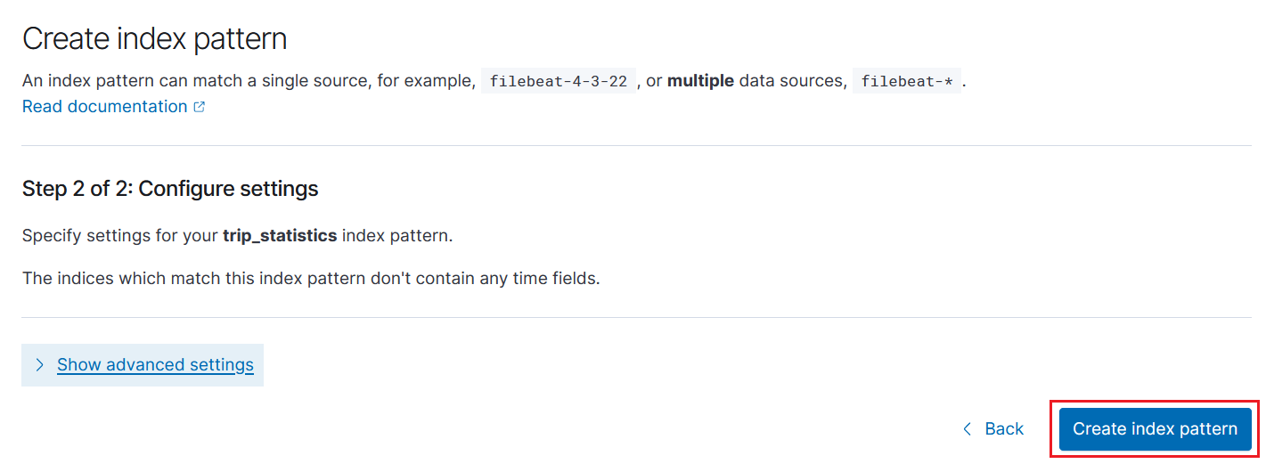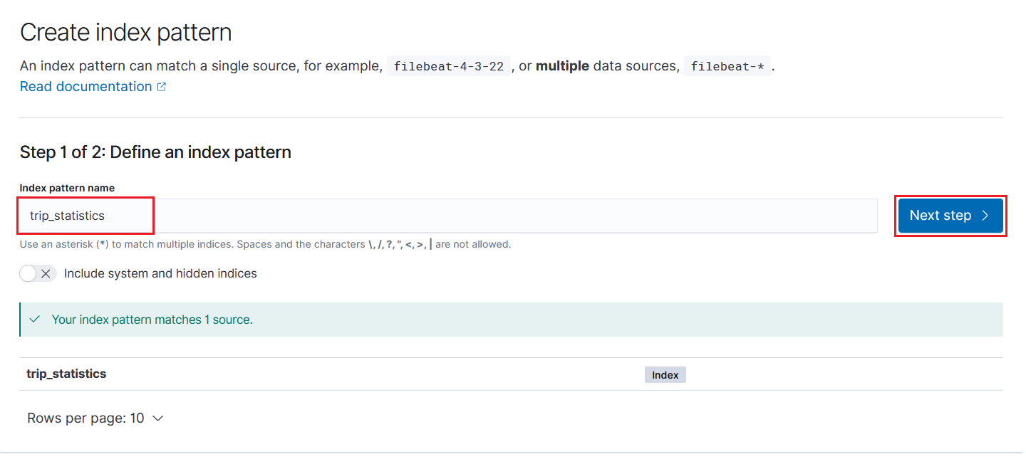 19. Index pattern name에 trip_statistics를 입력하고 Next를 클릭합니다.